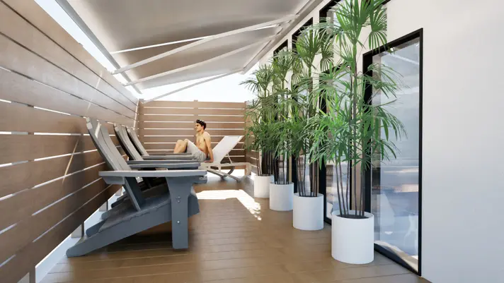 太陽光を浴びながら、屋外のリラックス空間で気持ちの良いひとときを。